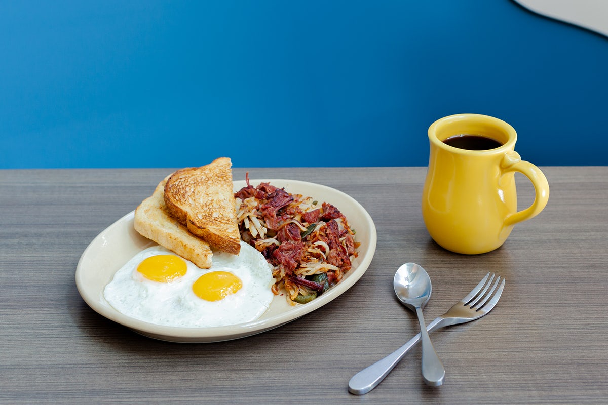 ................................US$14.50Signature shredded hash mixed with grass-fed, dry-rubbed corned beef, caramelized poblanos and onions. Served with two cage-free eggs and your choice of toast or tortillas.